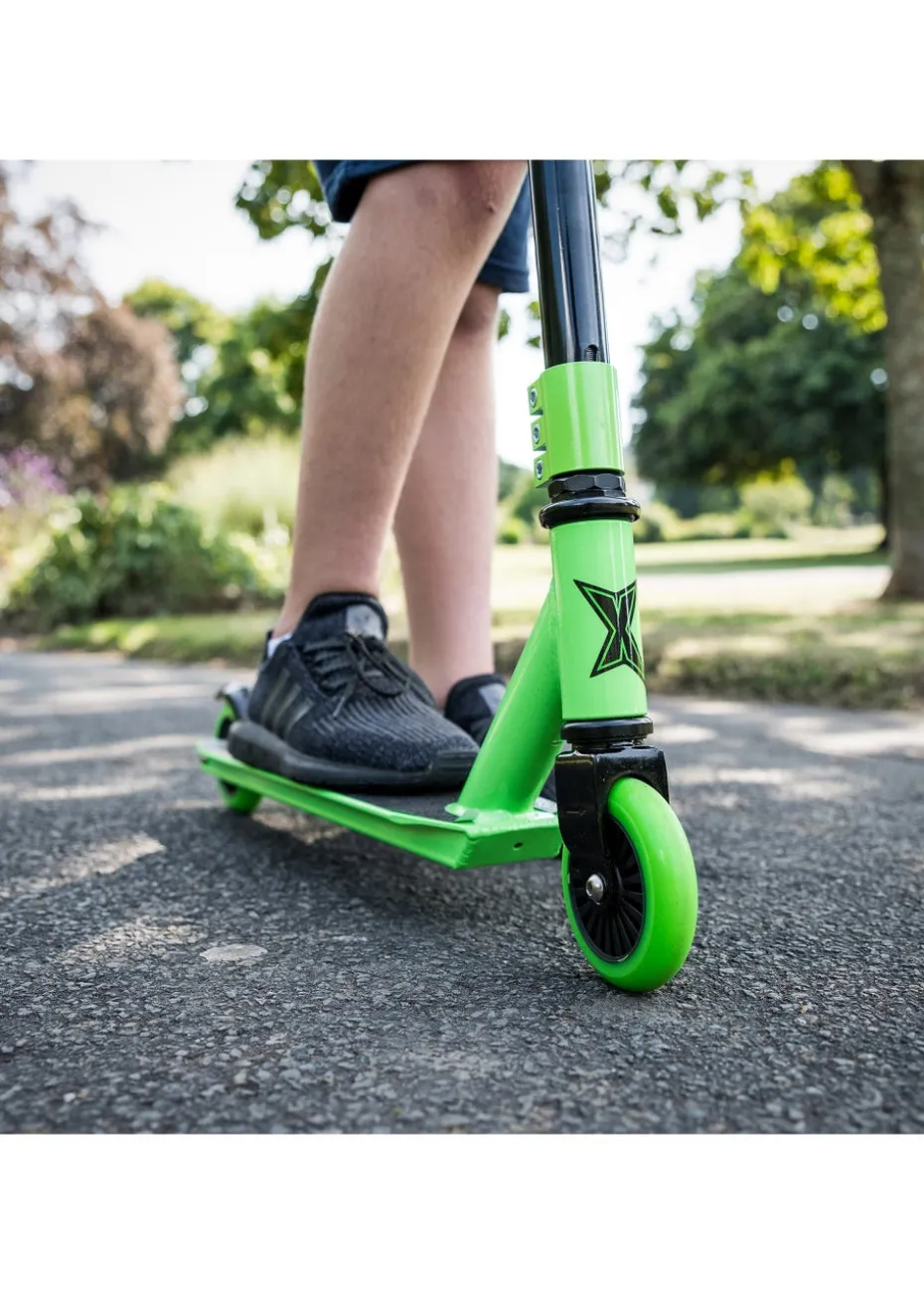 The Xootz Envy, one-piece Y-front Stunt Scooter is designed specifically for performing tricks; made from durable steel this strong framed scooter is built to last. The ABEC 7 bearings and robust 100mm PU wheels guarantee a smooth ride, and the reliable triple bolt clamp will keep your bars in place no matter how many stunts and 360 rotations of the reinforced steel handlebars you pull. The strong grip tape on the deck of this scooter alongside the high quality rear brake allows you to stay safe and in full control. Finished in an eye-catching green, this stylish stunt scooter looks as good as it performs. Maximum weight capacity: 60kg. Suitable for ages 6+.