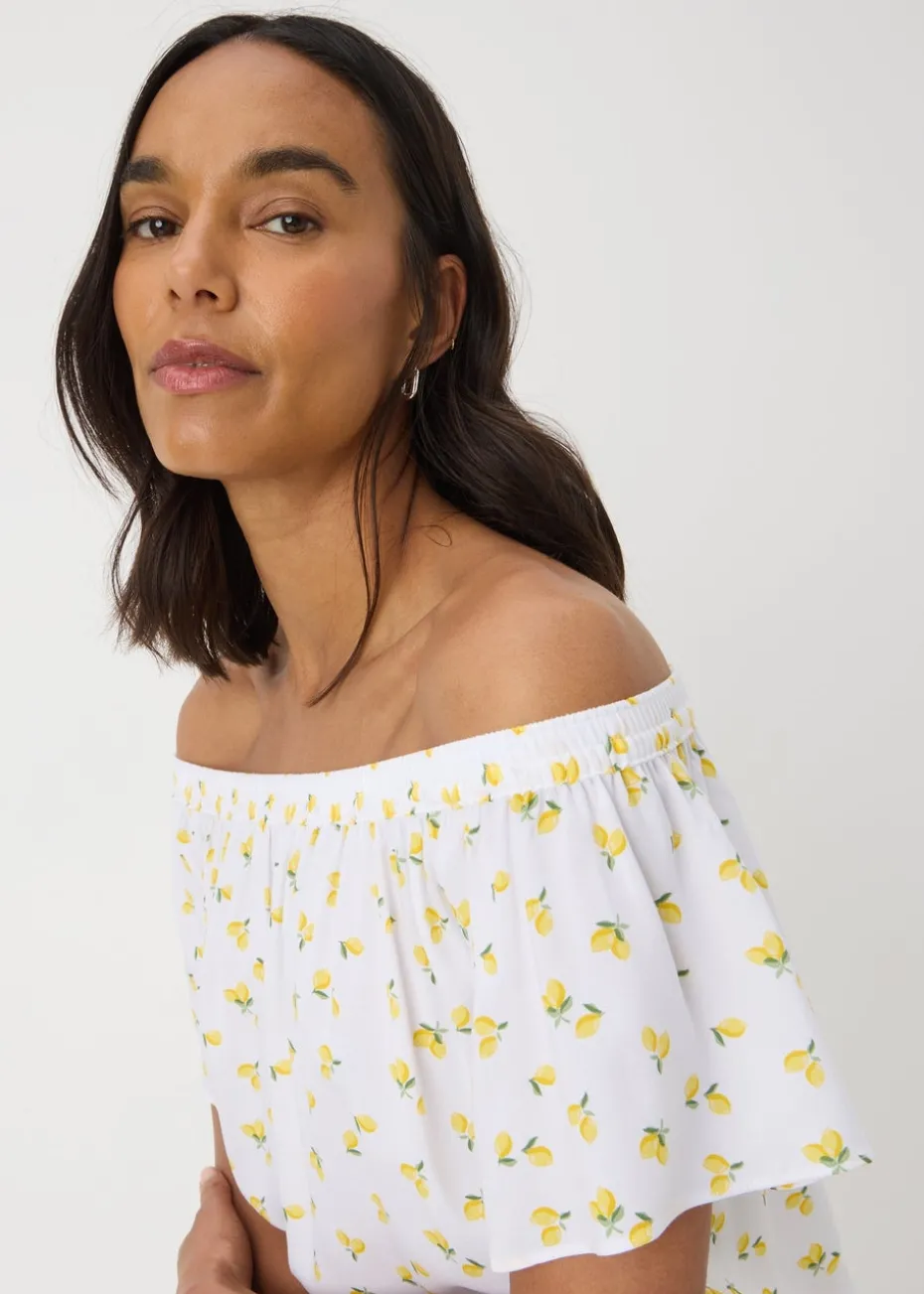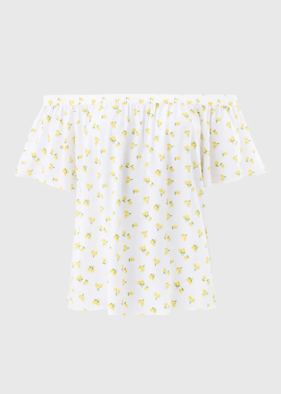 Add a pop of freshness to your wardrobe with this Yellow Lemons Bardot Blouse. Featuring a playful lemon print, this blouse offers a flirty off-the-shoulder Bardot neckline and billowing sleeves for a relaxed, feminine look. Made from lightweight fabric, it’s perfect for sunny days and breezy evenings.