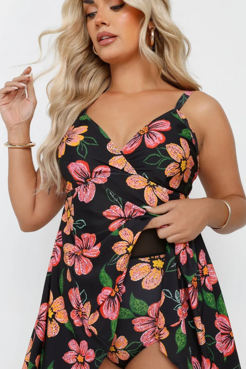 Yours Curve Black Floral Print Hanky Hem Swim Dress