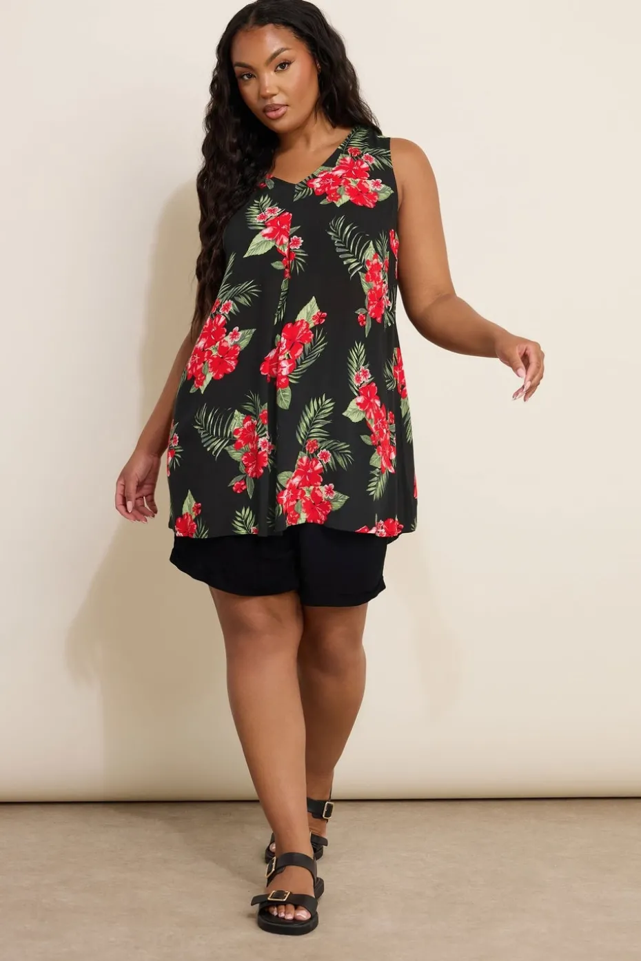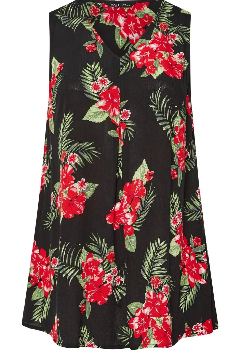 Wondering what to wear this summer Look no further than this must-have vest top. Made from a comfortable woven fabric, it features an hibiscus floral print with a v-neckline and pleated front. Team with denim shorts and sandals for an effortless daytime look. Model is 5’7″/173 cm and size UK 16 / EU 44.