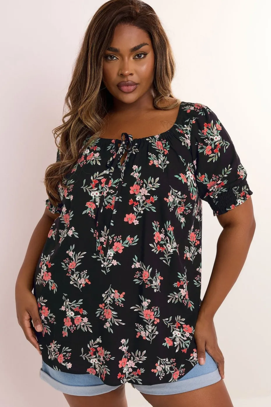 This must-have top is the perfect option for your casual summer plans. Made from a comfortable woven fabric, it features a floral print with short sleeves and tie front detail. Team with a pair of denim shorts and sandals for a look that is perfect for your next garden party or picnic with friends. Model is 5′ 8.5″/ 174cm and size UK 18/EU 46.