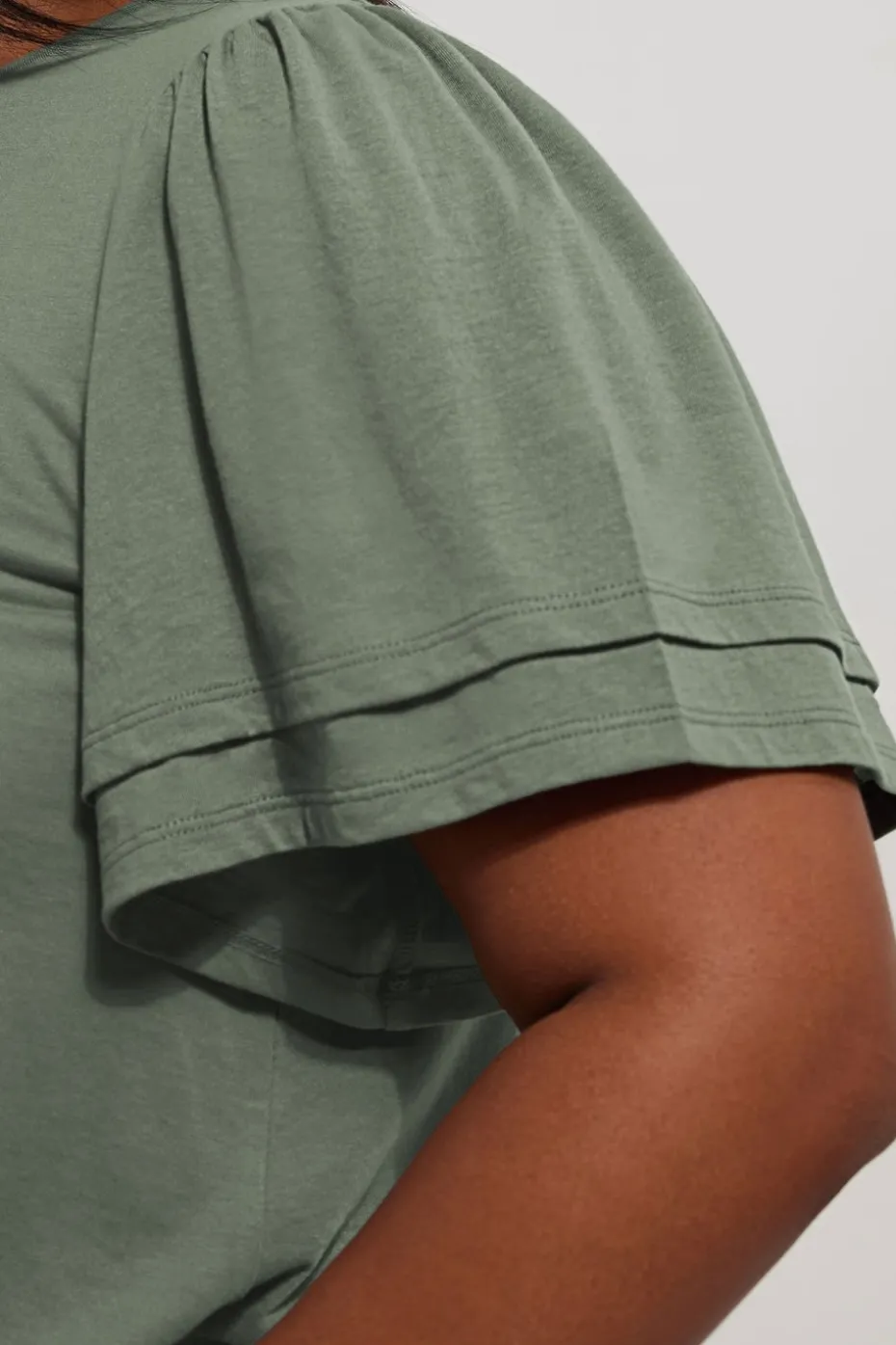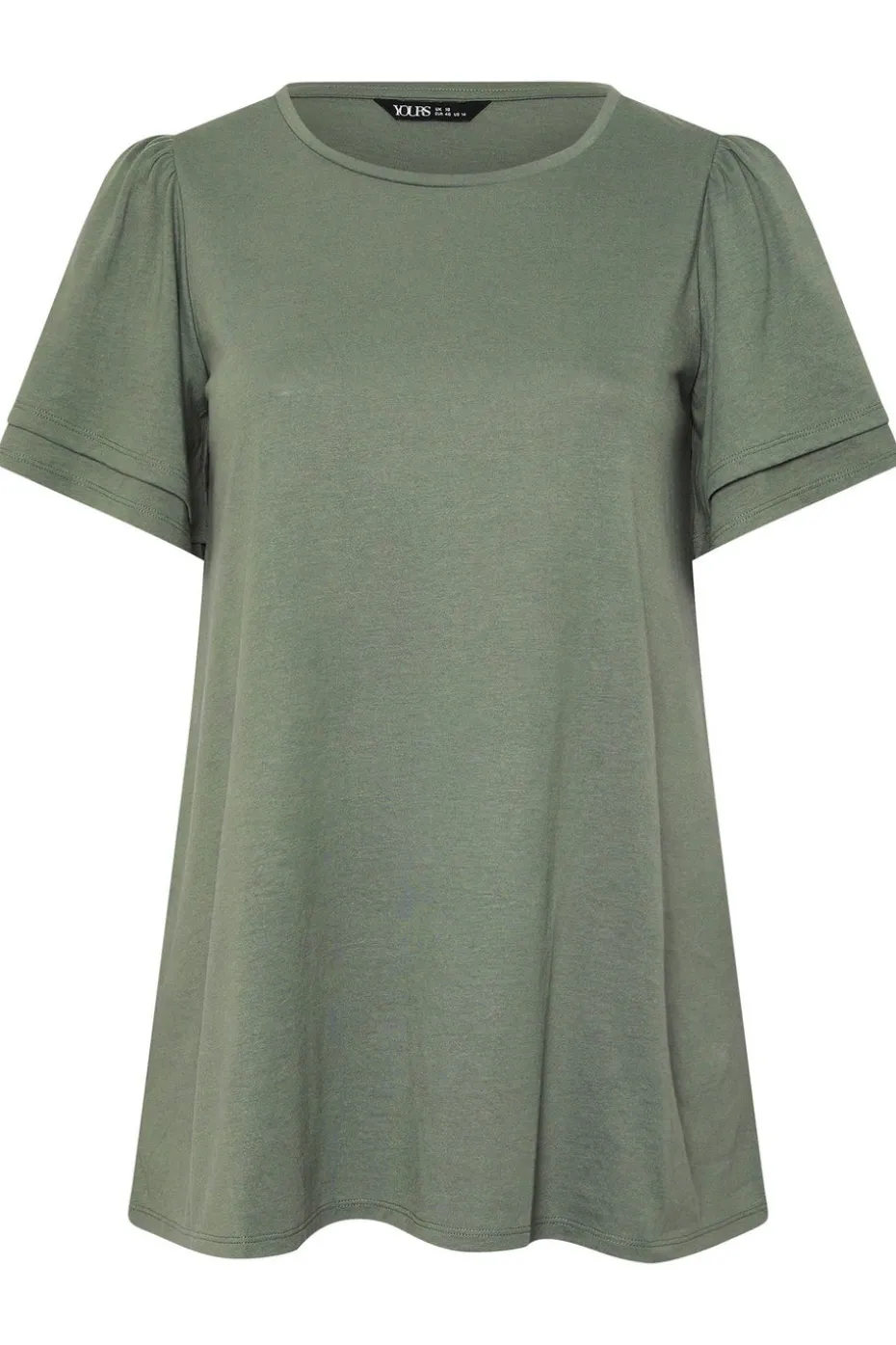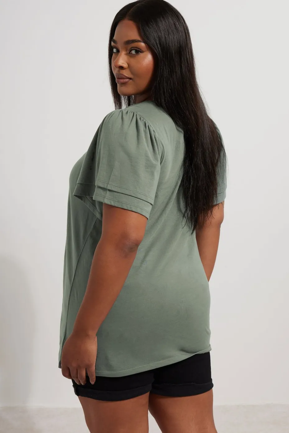 This new-in top is the perfect addition to your everyday wardrobe Made from a breathable woven fabric, it features a double frill design, with short angel sleeves and a crew neckline. Partner with denim shorts and sandals for the ultimate causal warmer weather look Model is 5′ 8.5″/ 174cm and size UK 18/EU 46.