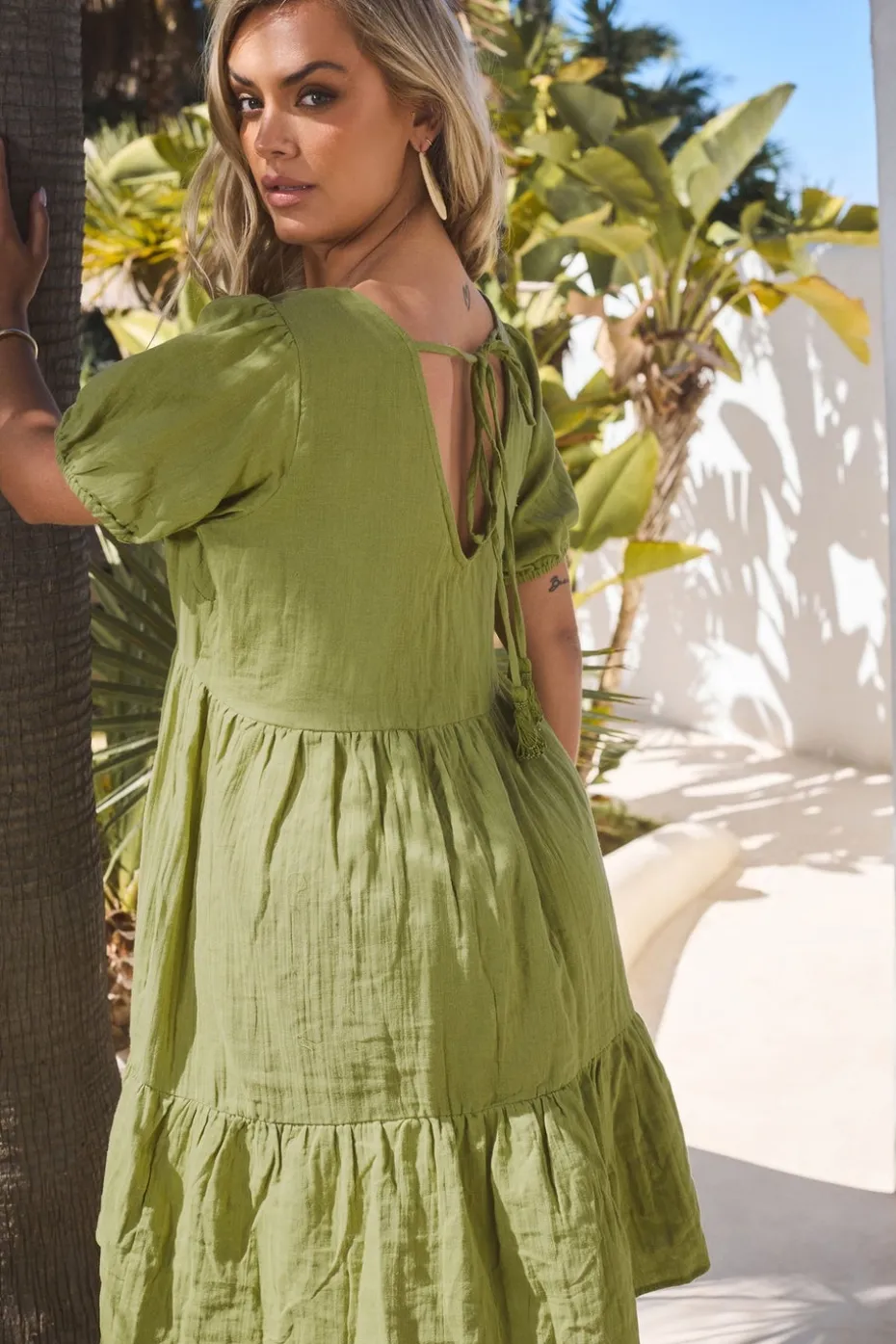 Step into summer with this must-have smock dress from Yours Curve Made from a soft cotton fabric, it features a tiered design, short puff sleeves, a mini length, and a tie back detail. Style with sandals and a denim jacket for a stylish warmer weather look you can rely on Model is 5’10.5″/178cm and size UK 16/EU 44.