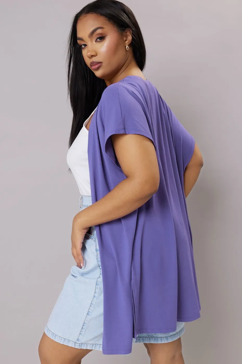 Add a lighter layer to your summer wardrobe with this must-have cardigan Made from a soft jersey fabric, it features short grown on sleeves, side split hem details, and an open design. Layer over a t-shirt and shorts for a casual everyday look you’ll love to wear Model is 5’7″/173 cm and size UK 16 / EU 44.