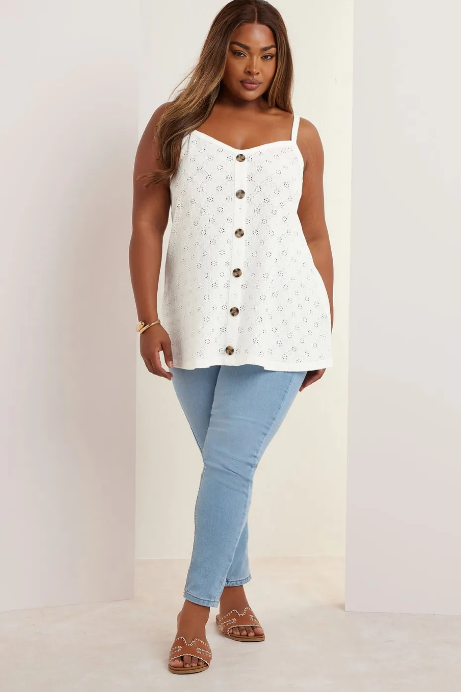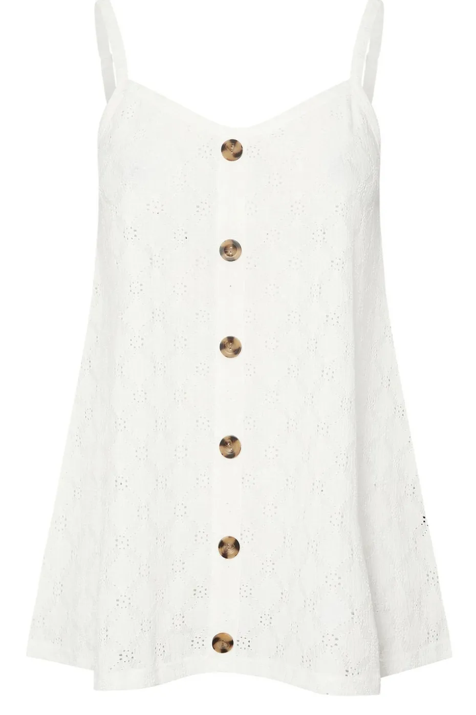 Enjoy this seasons newest trend with this must-have broderie anglaise vest top Made from a comfortable woven fabric, it features button front details, a v-neckline, a swing style, and adjustable straps. Style with denim shorts and sandals for an effortless everyday look you can rely on Model is 5’7″/173 cm and size UK 16 / EU 44.