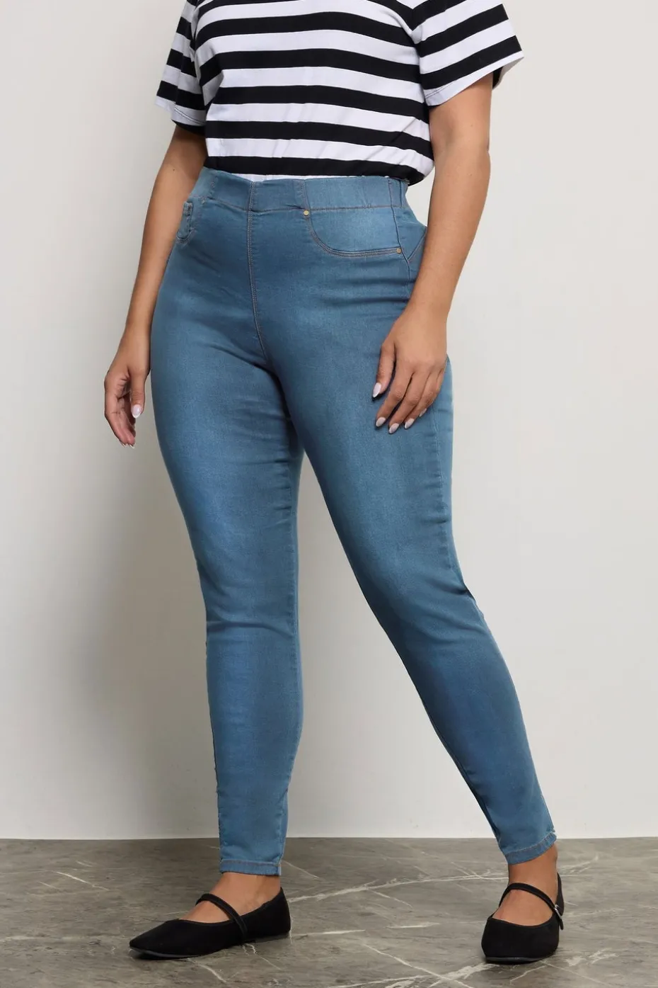 These mid blue pull-on bum shaper LOLA stretch jeggings from Yours Clothing are the perfect addition to your wardrobe. Crafted from a comfortable stretch fabric, these jeggings feature an elasticated waistband, functional pockets to the back, faux pockets to the front, and innovative seam detail. The excellent fabric recovery ensures a long-lasting fit, while the washed finish enhances the bum shape. Perfect for everyday wear, these jeggings are made from 73% Cotton, 25% Polyester, and 2% Elastane and are machine washable. Model is 5′ 9.5″ / 176.53 cm and size UK 16/EU 44.