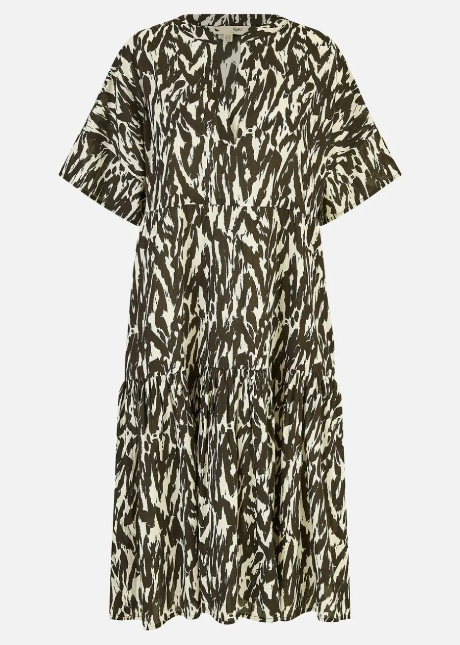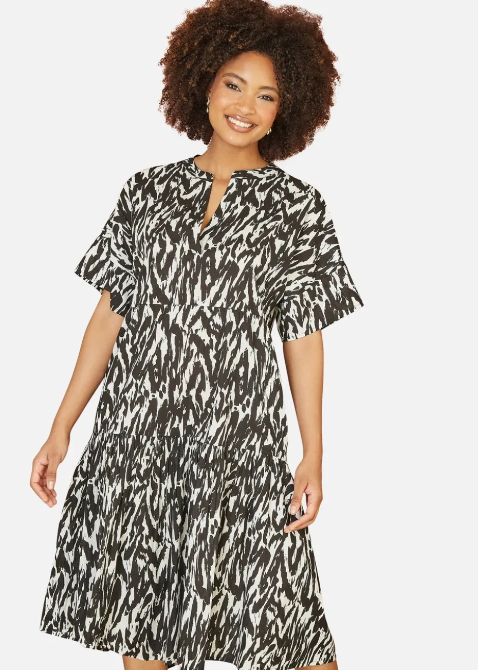 Light and airy tunics are perfect for the Summer – This one from Yumi has a unique animal print that has been designed in house. The organic cotton is cool and soft, perfect for hot weather, we love this styled with sandals and a rattan bag for a walk along the beach on holiday. The tiered hem, notched neckline and kimono style sleeves all add to the easy shape of this dress.