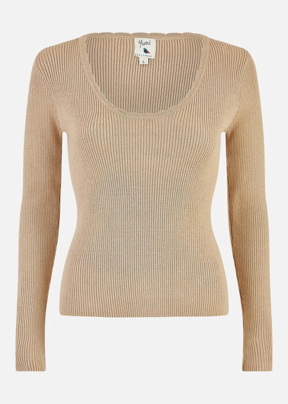 This cute fitted top from Yumi is perfect for the changing seasons – In a shimmering Metallic lightweight knit, the ribbed design adds some comfort to this style. The scallop round neckline and long sleeve design is perfect for pairing with your jeans and trainers for a casual look.