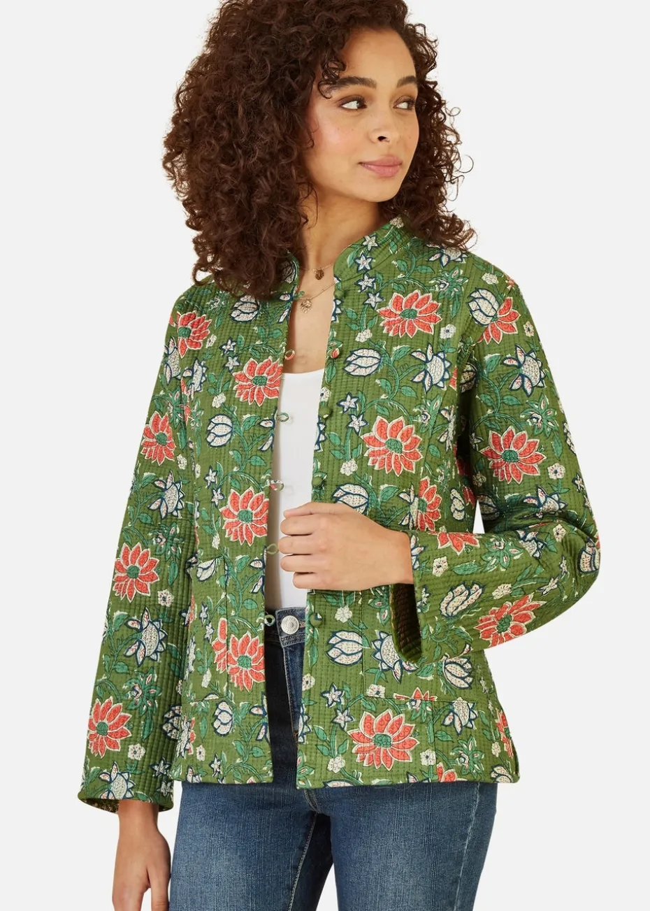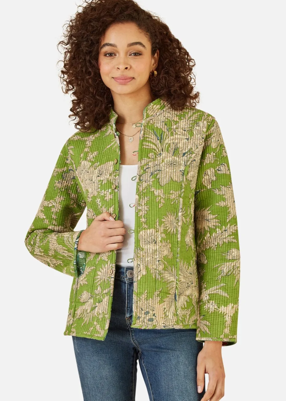 Yumi Green Floral Print Reversible Cotton Cropped Quilted Jacket