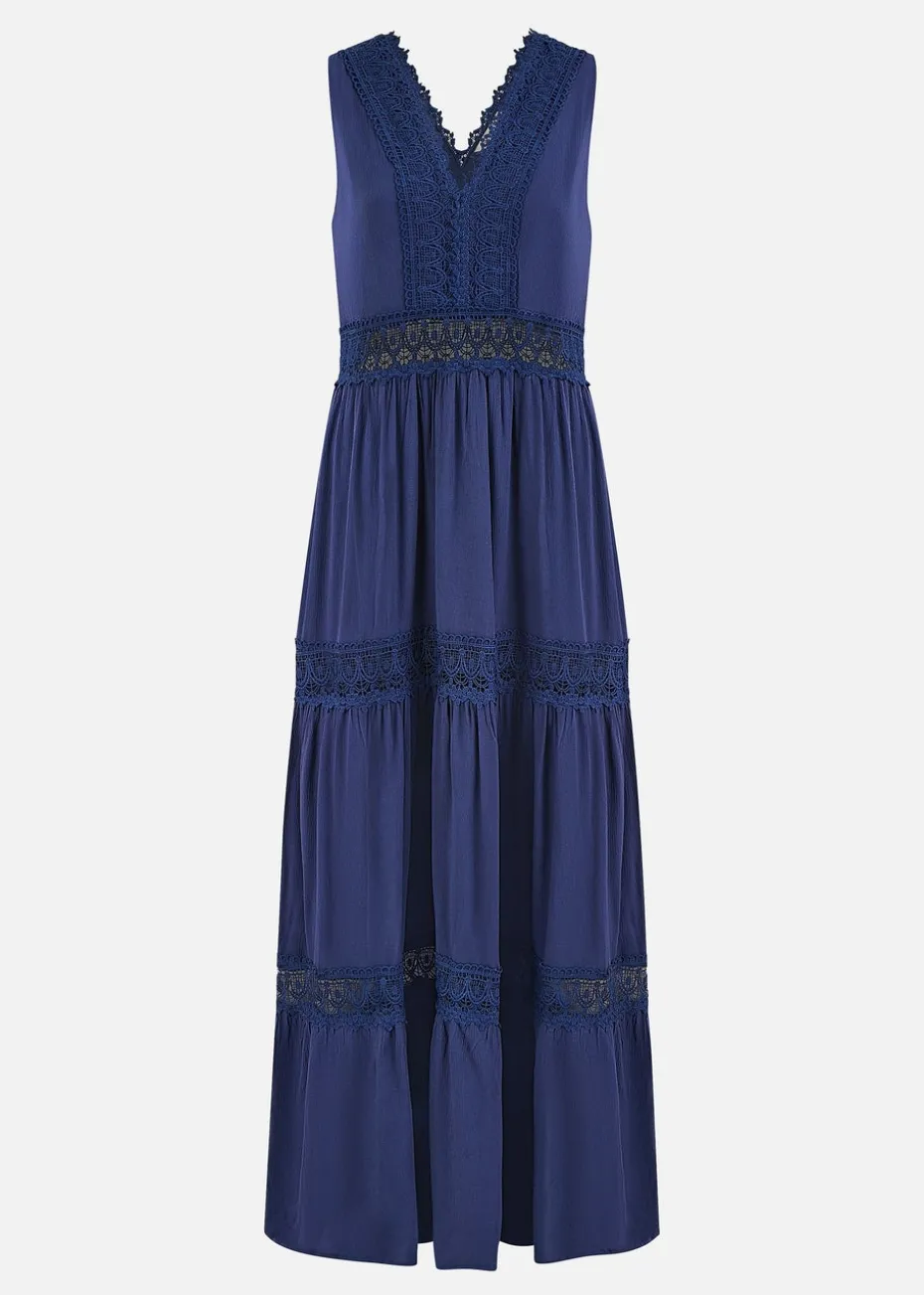 Bohemian beachy vibes tick! This midi dress from Yumi is the ultimate companion for those vacays this summer. Crafted from a lightweight cotton mix, the flowy fit and cute cut outs in the waistline and skirt are designed for that effortless beach side chic. With lace trims on the V neckline and modesty lining. This really is the perfect Navy summer dress.