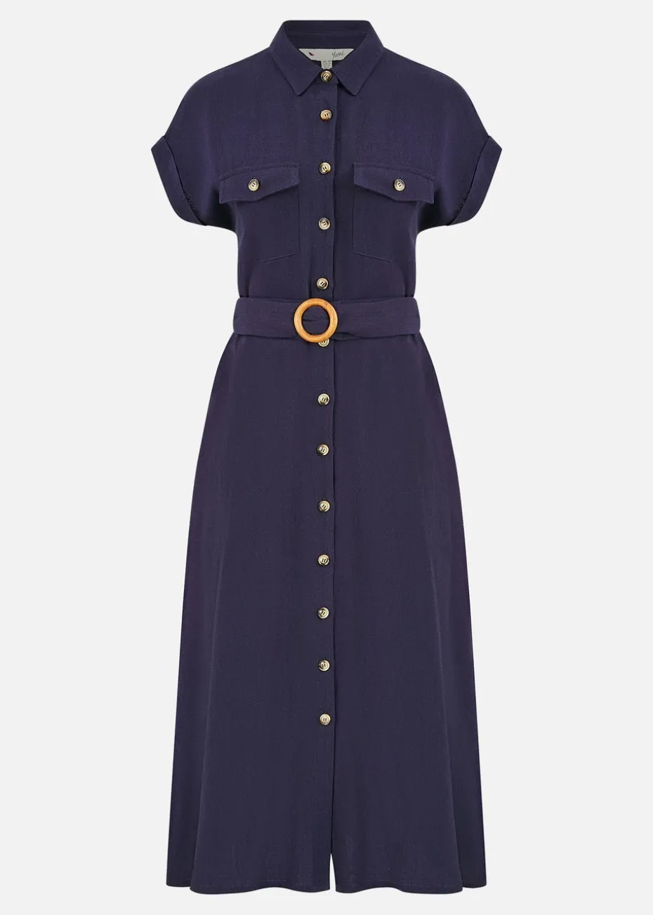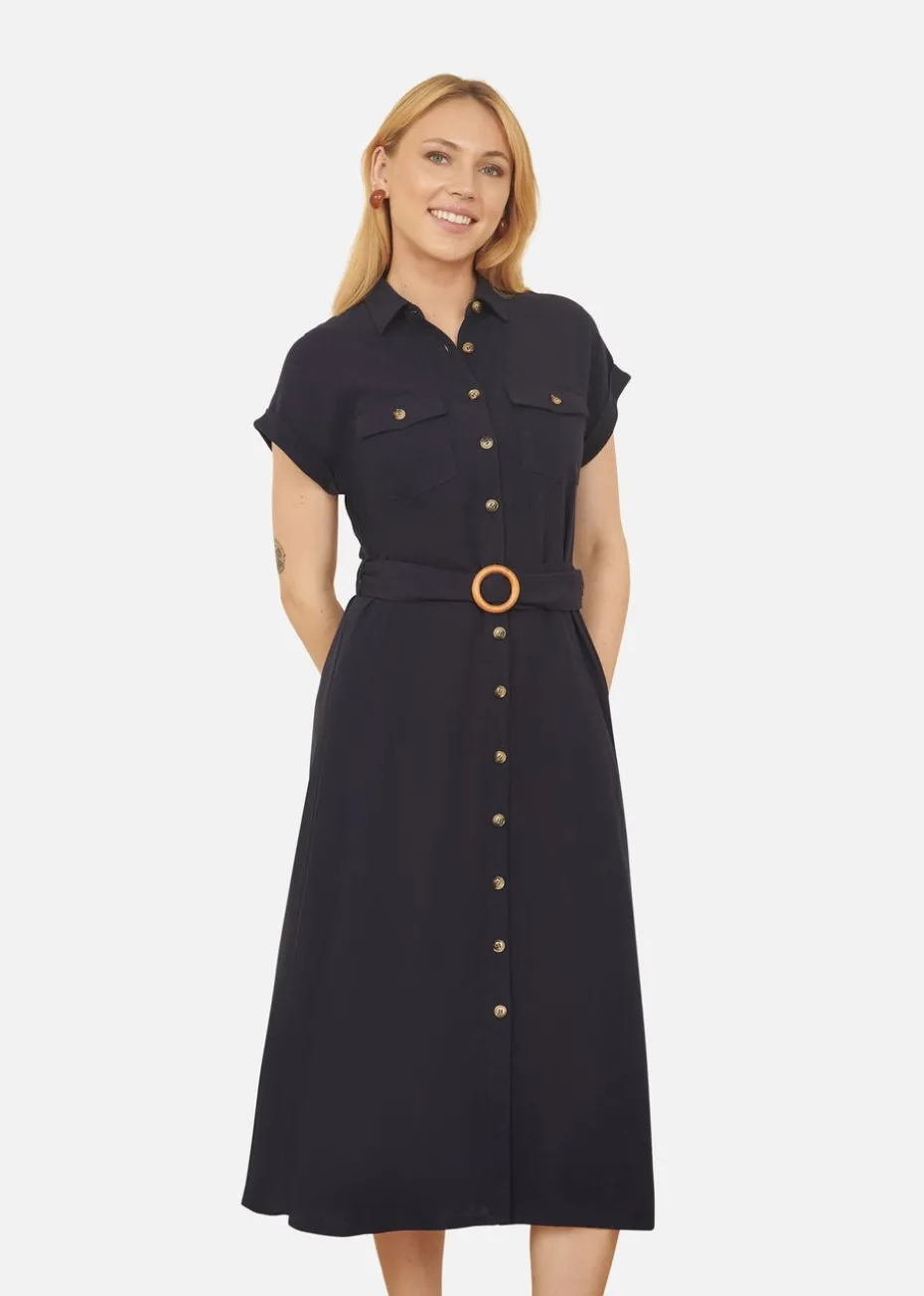 Be the first to review “Yumi Navy Viscose Linen Look Midi Shirt Dress With Wooden Belt” Cancel reply