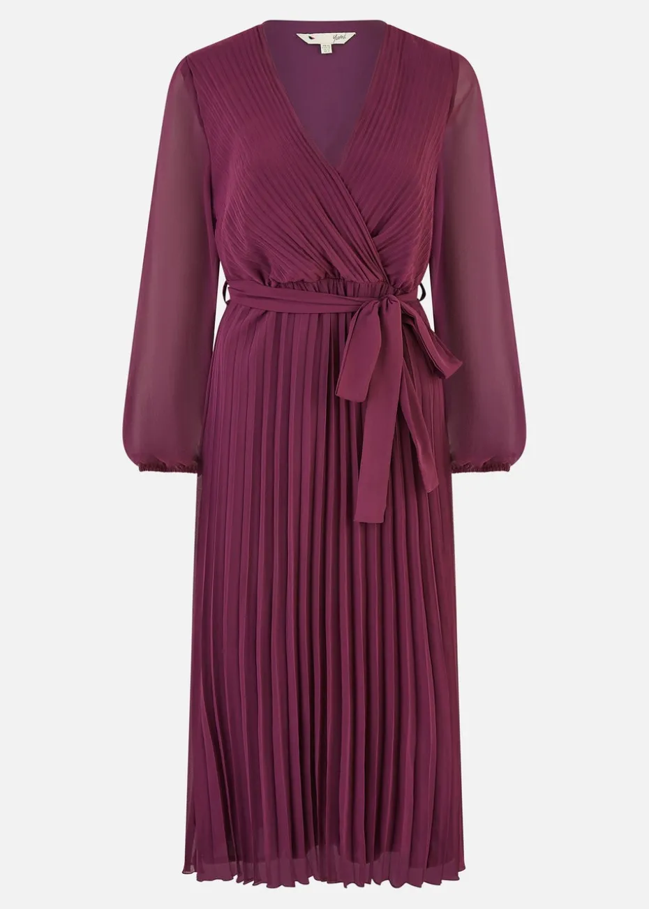 This gorgeous pleated midi dress is perfection for the party season. In a skater style wrap over style with a cinch waist and pleats throughout. The sheer long sleeves are gorgeous for the winter months, we love this for a winter wedding paired with gold accessories for a luxurious feel.