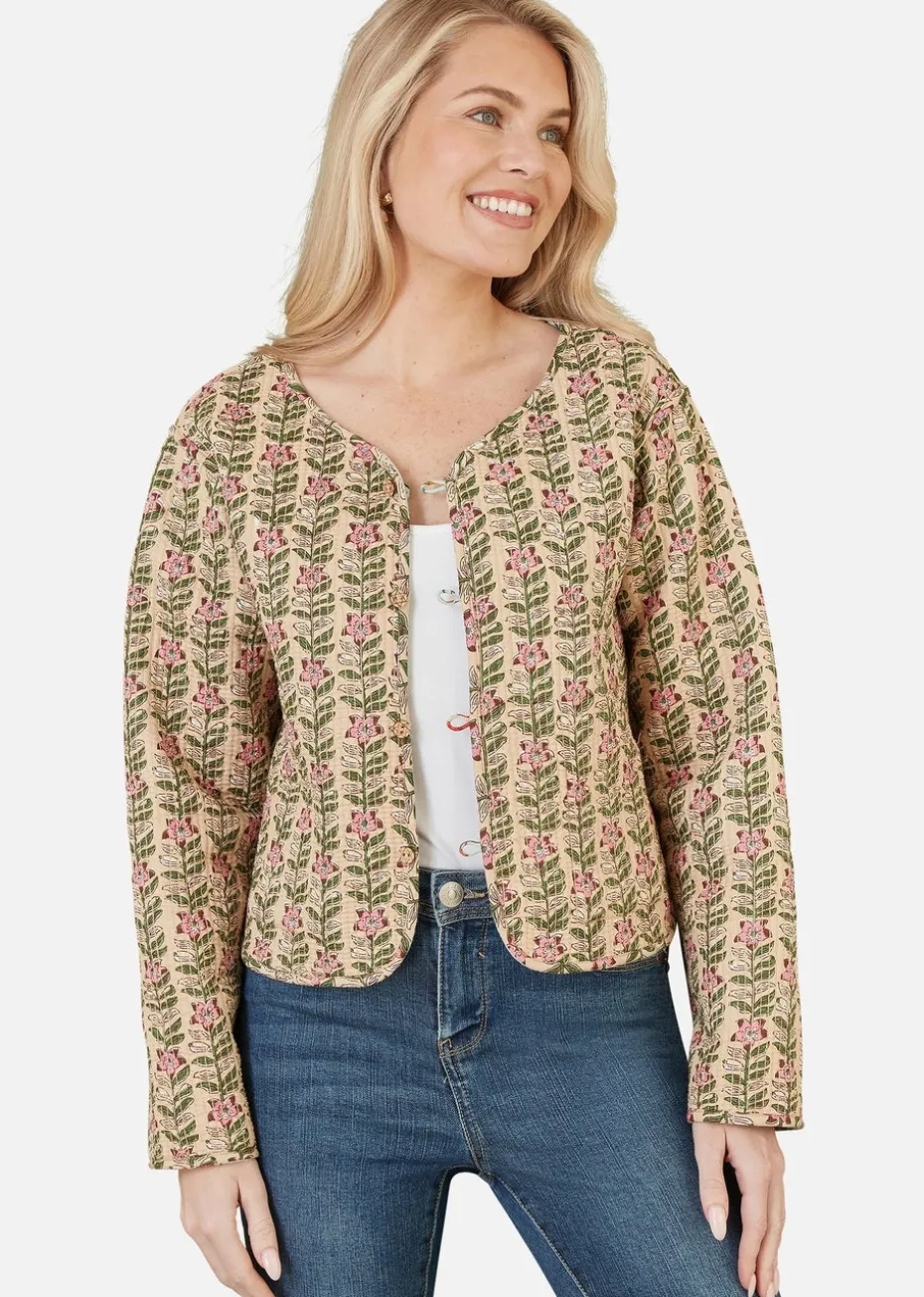 Yumi Stone Floral Print Reversible Cotton Cropped Quilted Jacket