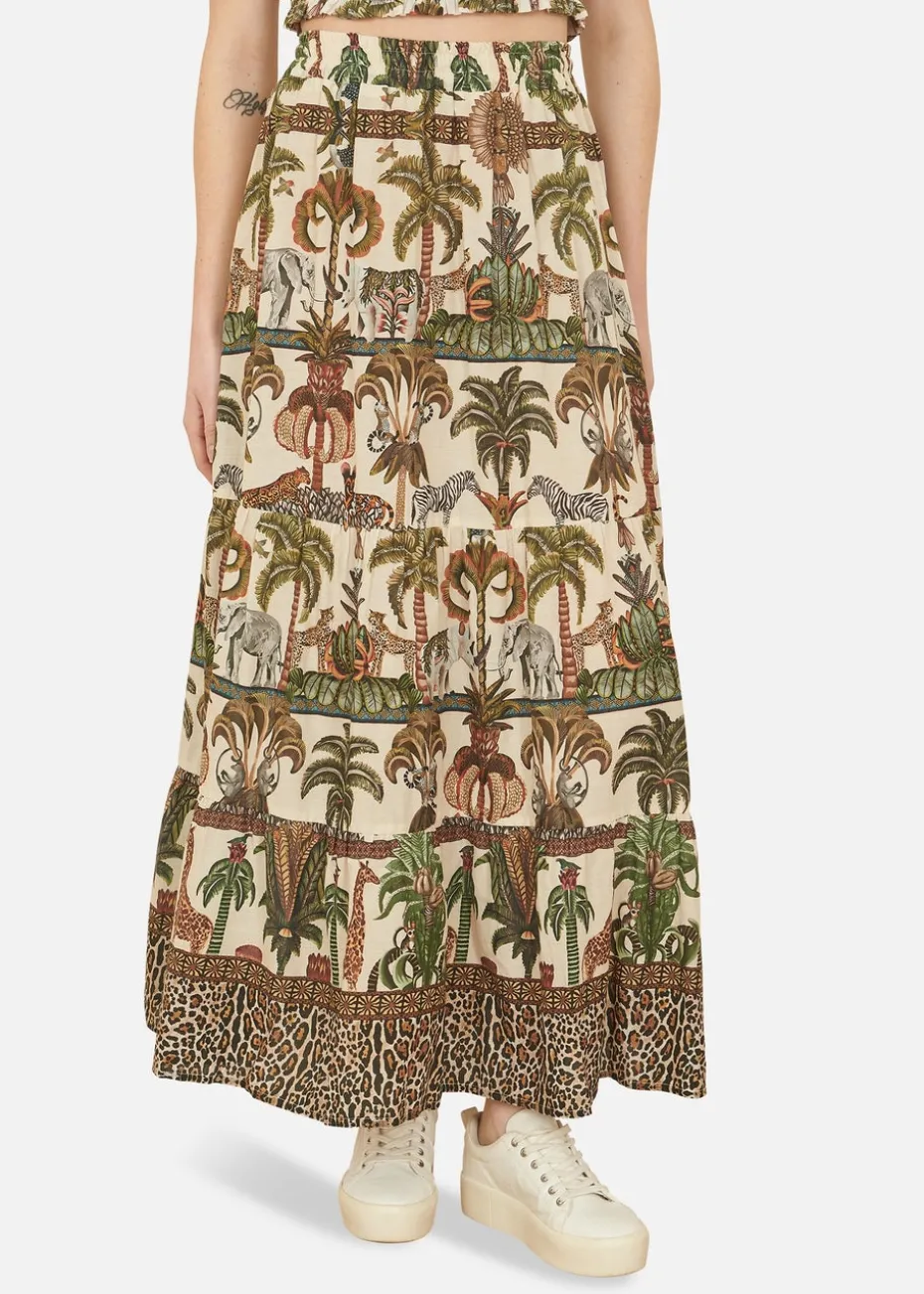 Made from lightweight organic cotton this midi skirt is perfect for summer time, With a safari animal print designed in house for Yumi, we love it as a co-ord outfit with the matching top, or styled with a plain t-shirt for a holiday feel.