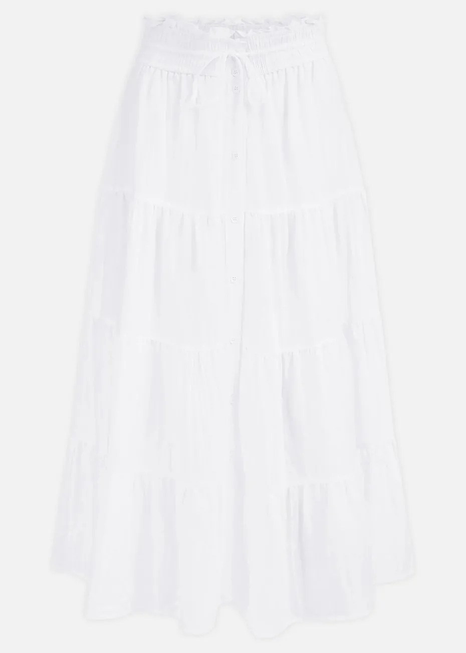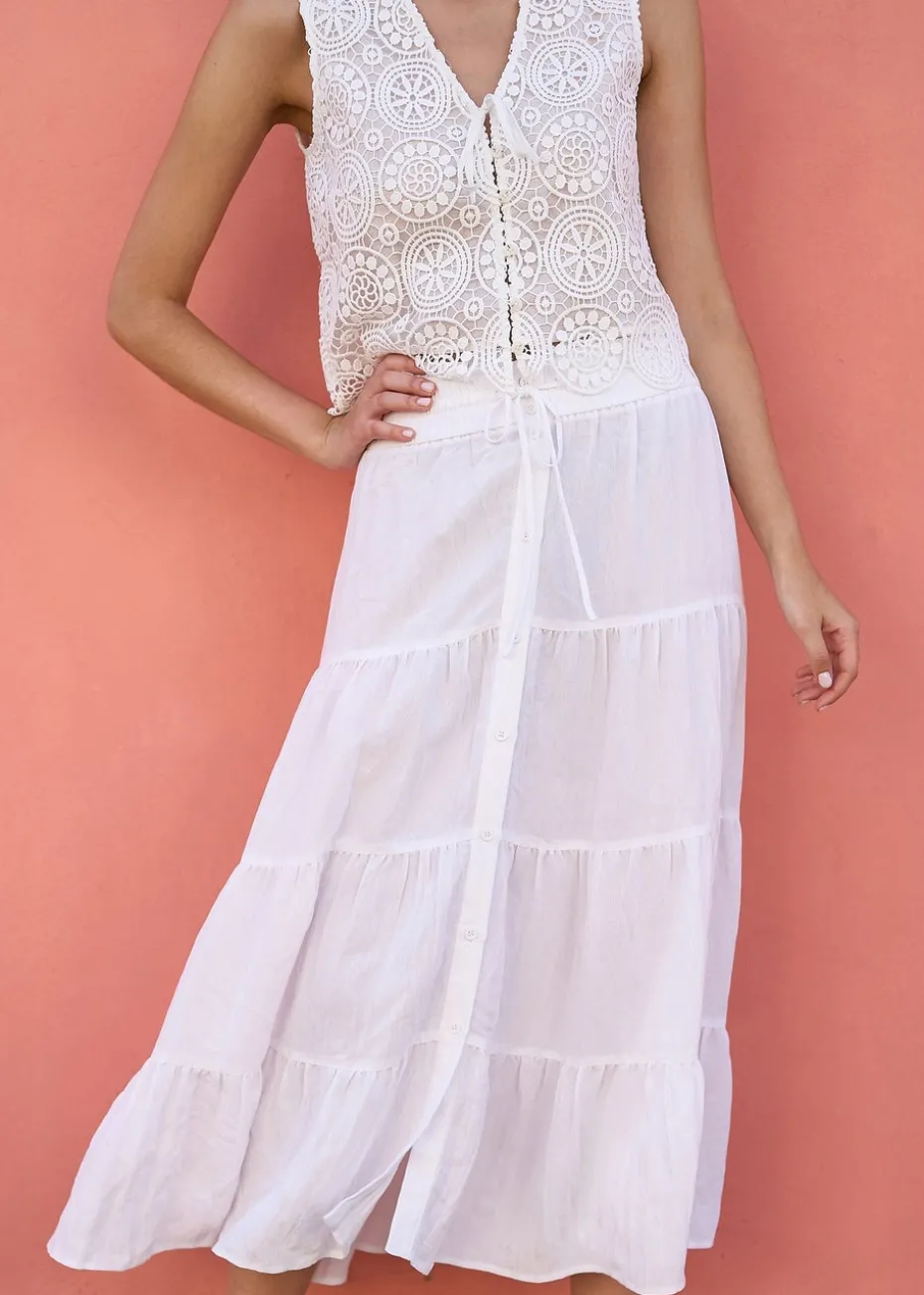 Boho babes assemble! This classic midi style with a tiered look, made from a lightweight rayon fabric will have you swishing through the summertime, With a button up detail in the front, and tie at the waistline, style with crochet tops and sandals for a vibey look.