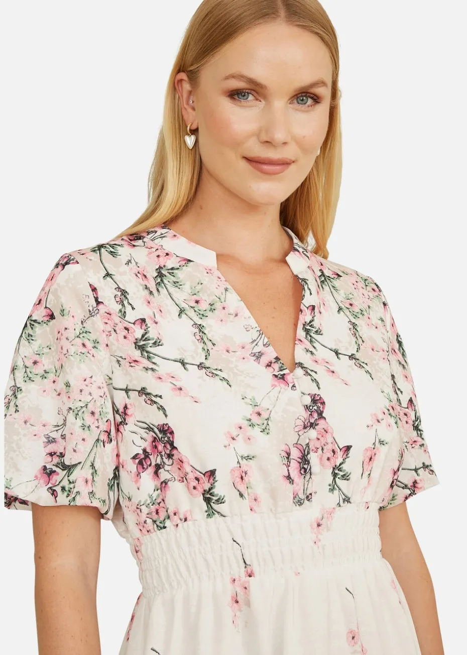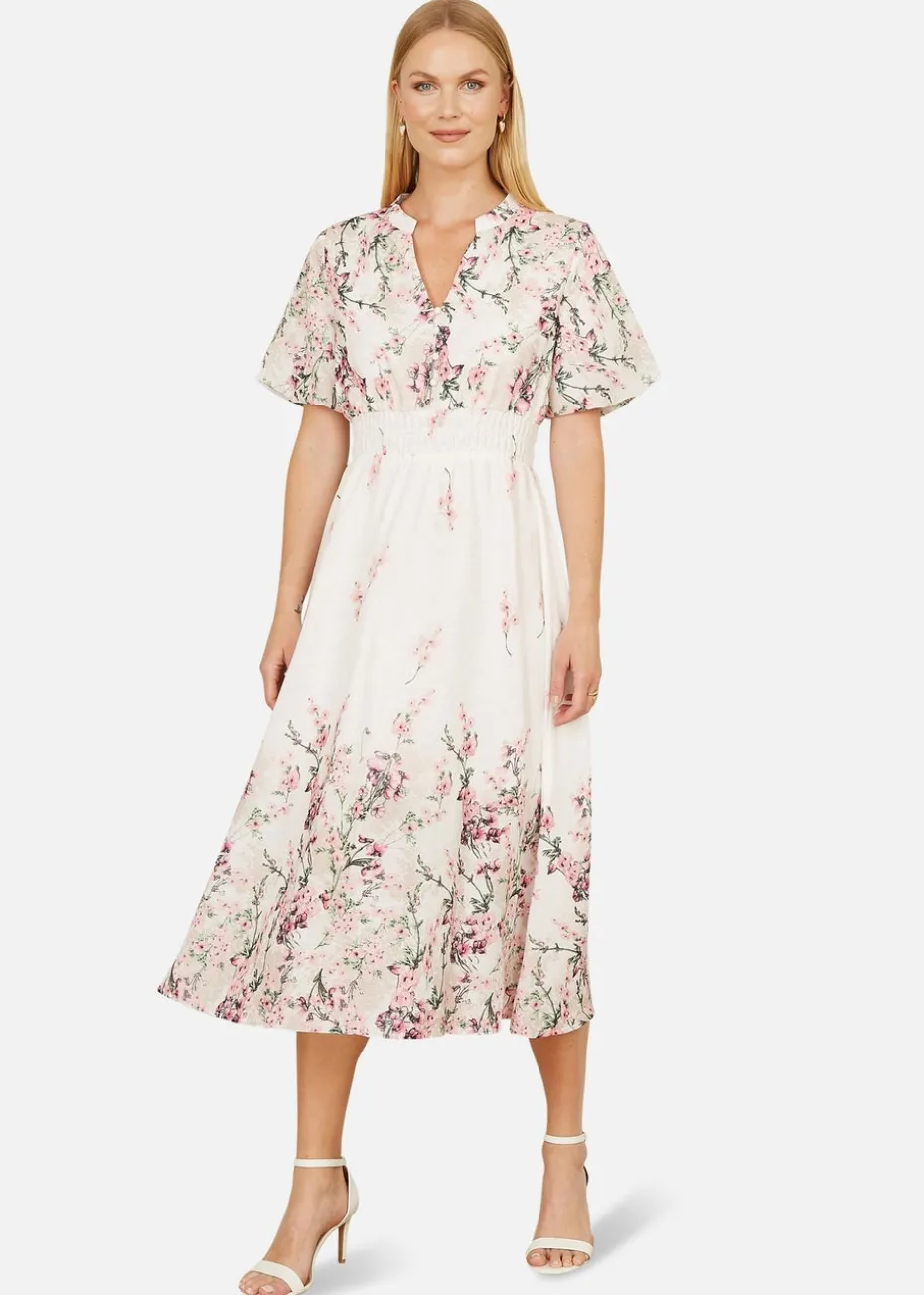 This mirrored floral print dress is extra special for spring invites. The V neckline is framed with angel sleeves and a button down design. The midi length floats in a fit and flare shape that is super flattering, especially when you factor in the ruching at the waist which adds an element of comfort to this piece.